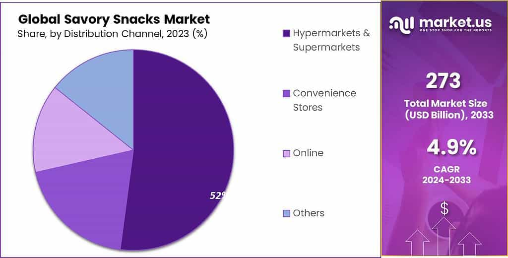 • Product Dominance: Potato Chips hold over 68.2% of the market share, followed by Corn and Tortilla Chips, Nuts and Seeds, Popcorn, and Pretzels.