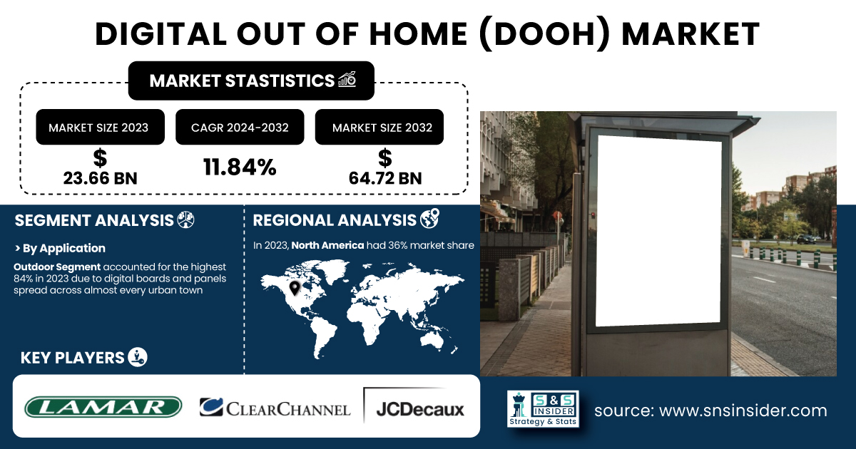 AUSTIN, TX, UNITED STATES, January 31, 2025 /EINPresswire.com/ -- Market Size & Industry InsightsAs Per the SNS Insider,“The Digital Out of Home Market size was USD 23.66 billion in 2023 and is expected to reach USD 64.72 Billion by 2032, growing at a CAGR of 11.84% over the forecast period of 2024-2032.”