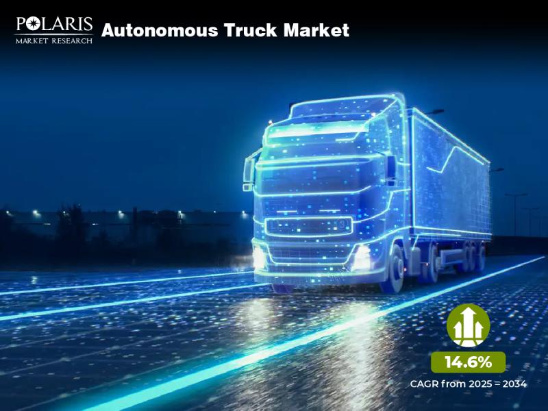 Polaris Market Research's latest report, titled "Autonomous Truck Market,โ 2025-2034. The report covers key success factors, market performance, risk factors, project costs and economics, expected ROI, and profit margins. The global market was valued at USD 42.34 billion in 2024 and is expected to grow to USD 164.89 billion by 2034 at a CAGR of 14.6% from 2025 to 2034.