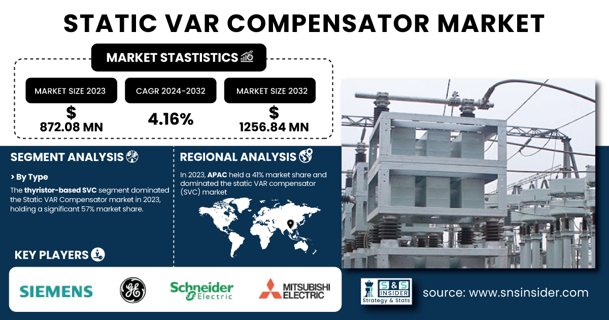 AUSTIN, TX, UNITED STATES, February 3, 2025 /EINPresswire.com/ -- Market Size & Industry InsightsAs Per the SNS Insider,“The Static VAR Compensator Market Size was valued at USD 872.08 Million in 2023 and is expected to reach USD 1256.84 Million by 2032 and grow at a CAGR of 4.16% over the forecast period 2024-2032.”