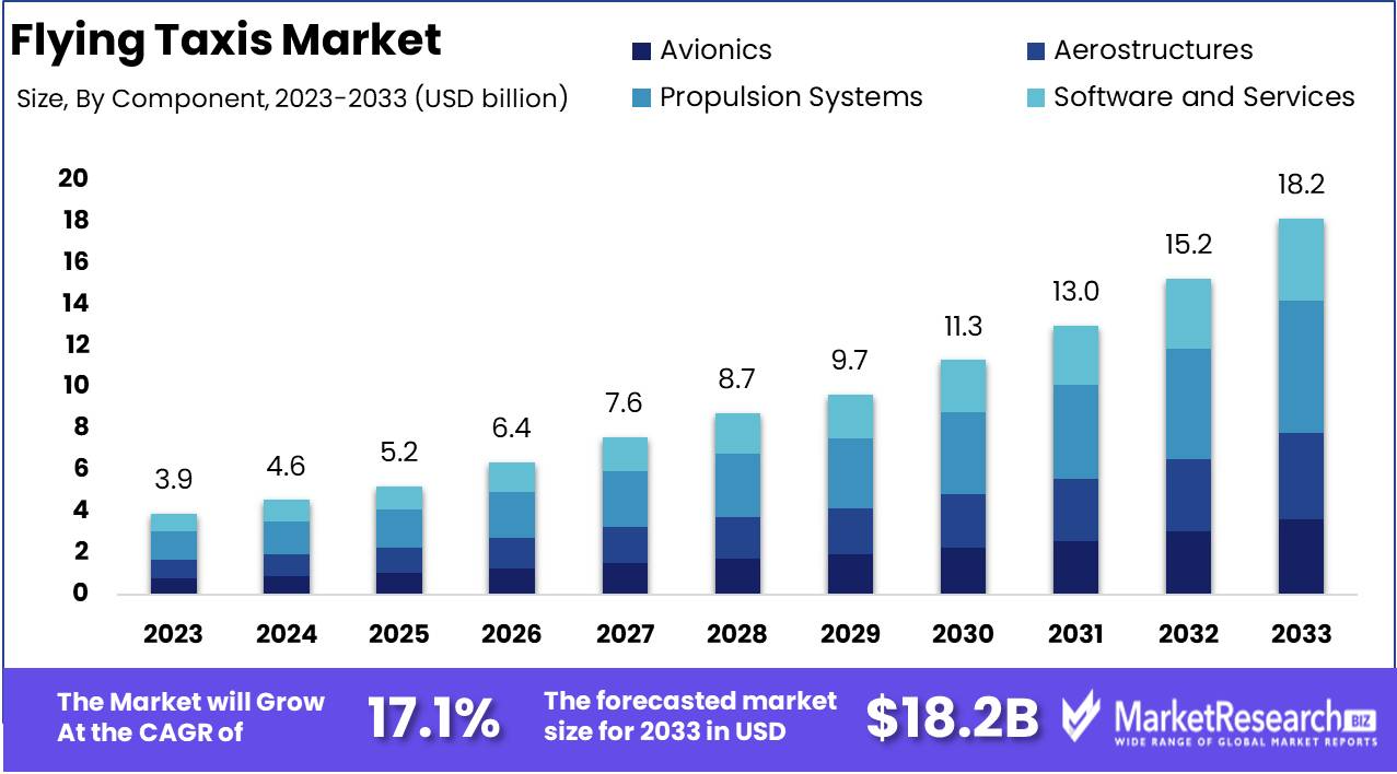 -- Market Value: The Global Flying Taxis Market was valued at USD 3.9 Bn in 2023. It is expected to reach USD 18.2 Bn by 2033, with a CAGR of 17.1% during the forecast period from 2024 to 2033.