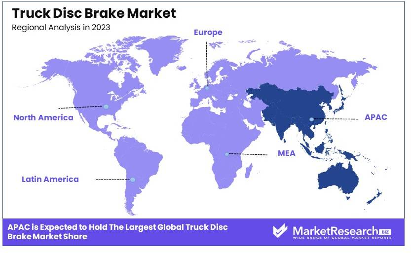 The Asia Pacific region leads the truck disc brake market with approximately 37% of the global share, driven by its extensive automotive manufacturing base. This region is the hub for several of the world’s largest vehicle manufacturing countries, including China, Japan, India, and South Korea, which collectively produce a significant portion of the world’s commercial vehicles. The demand for disc brakes in trucks is spurred by increasing regulations related to vehicle safety standards and a rising emphasis on reducing vehicle stopping distances.
