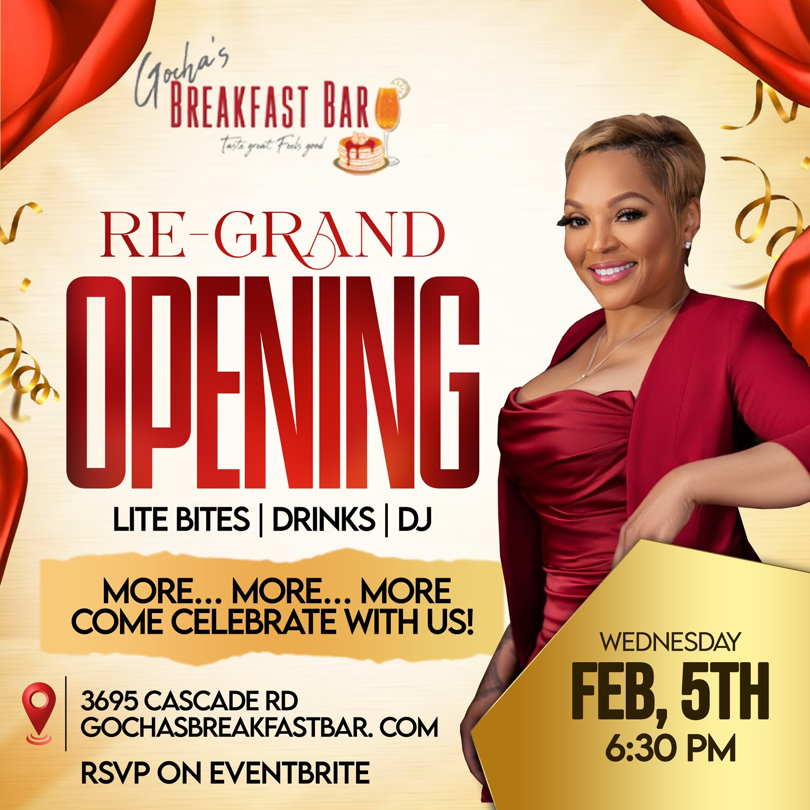 The grand reopening will take place on February 5, 2025, at Gocha’s Breakfast Bar’s Cascade location, 3695 Cascade Rd Suite 440, Atlanta, GA. Visionary chef, entrepreneur, and star of We TV’s Bold & Bougie, Gocha Hawkins, invites the community to join in the celebration of the upgraded dining experience, featuring a refreshed ambiance, exciting new menu offerings, and the same welcoming atmosphere that patrons have come to know and love.