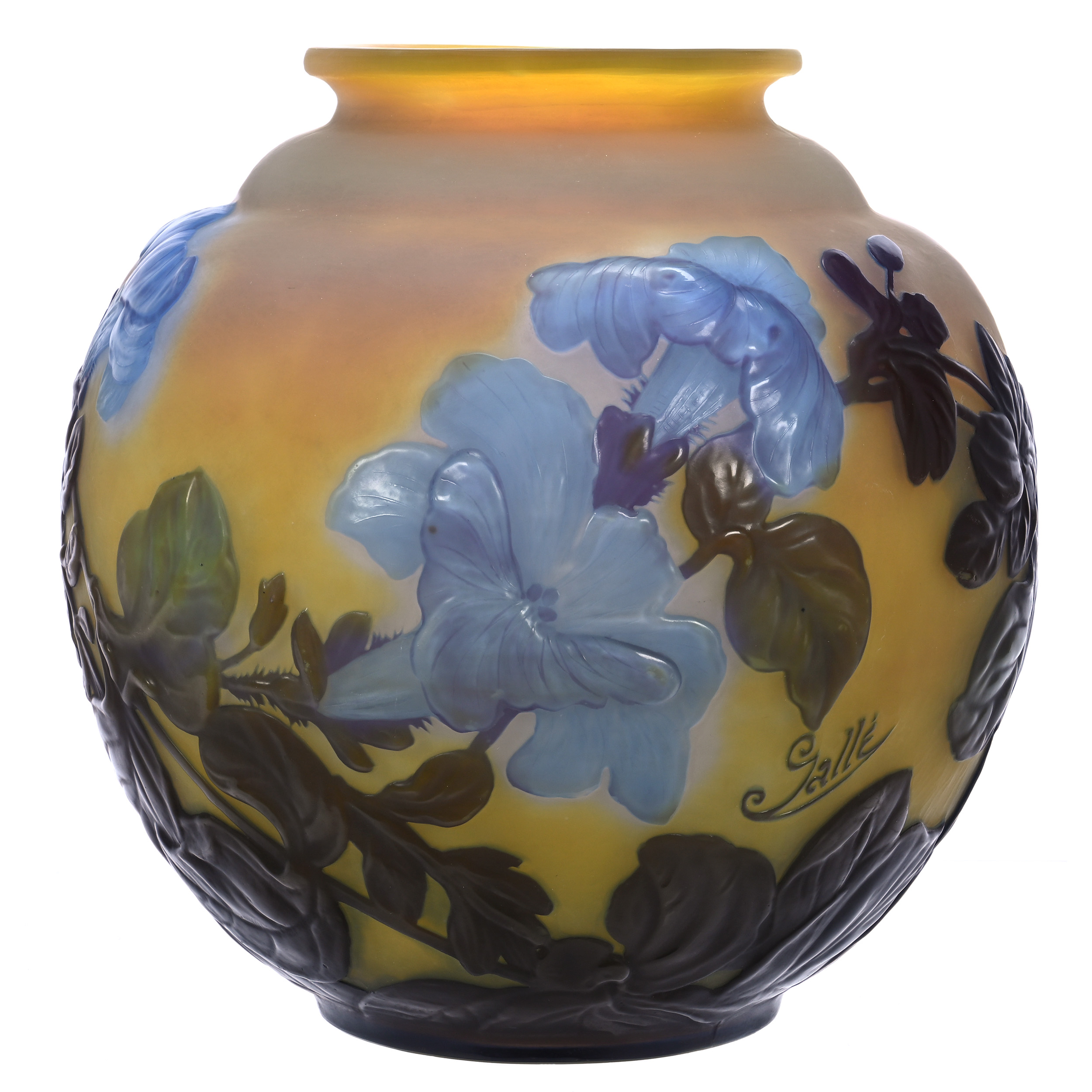 Bulbous French Cameo vase signed Galle in the Morning Glory pattern, having a yellow ground with blue and green cameo cutback souffle, a fantastic example (est. $5,000-$10,000).