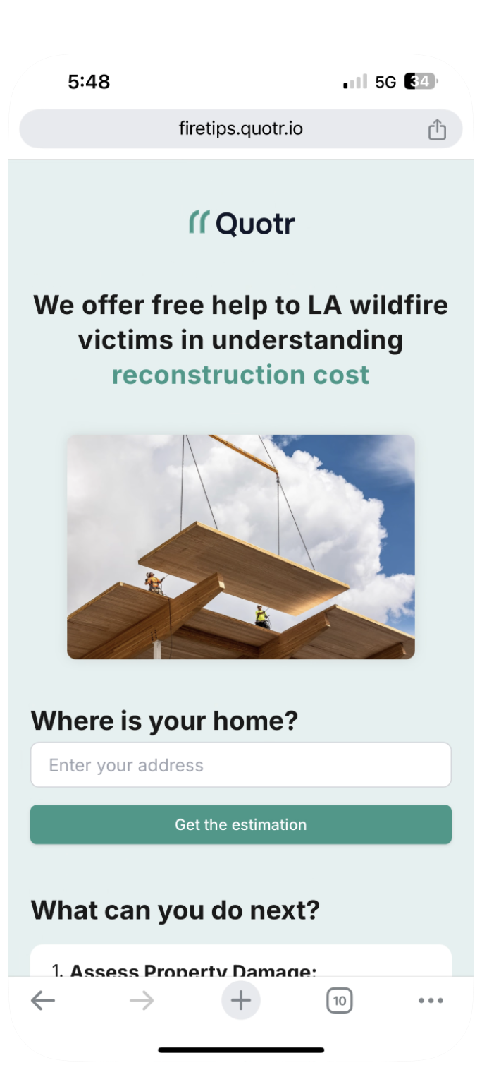 Quotr's FireTips tool provides essential, accurate, and localized data to people who are confronting property damage and loss as a result of the LA fires. It provides instant estimates of rebuild costs and project timelines, while also offering helpful resources that can accelerate decision-making processes and improve the quality of these decisions.