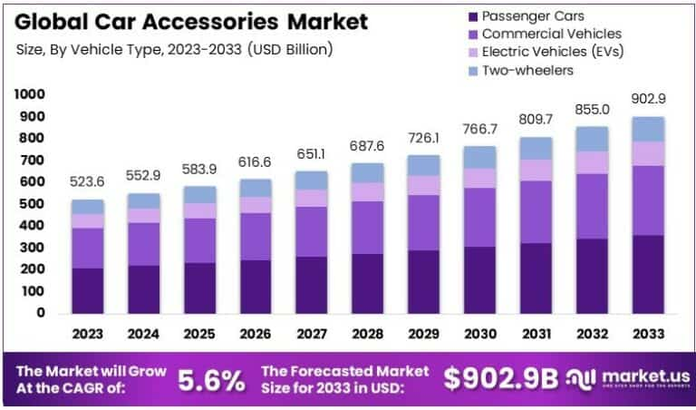 Car Accessories Market to Reach 902.9B USD by 2033 from 523.6B USD in 2023 at 5.6% CAGR
