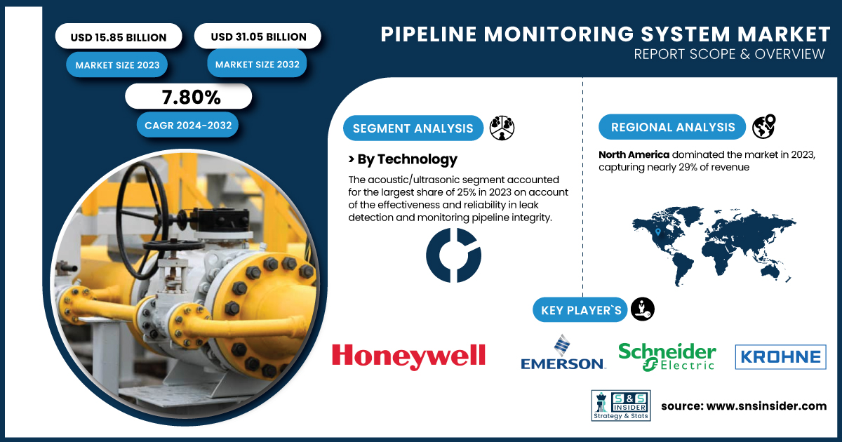 AUSTIN, TX, UNITED STATES, February 6, 2025 /EINPresswire.com/ -- The SNS Insider report indicates that the Pipeline Monitoring System Market Size was valued at USD 15.85 Billion in 2023 and is expected to reach USD 31.05 Billion by 2032, growing at a CAGR of 7.80% over the forecast period 2024-2032. The demand for real-time monitoring, safety improvements, and the prevention of failures are the primary drivers of rapid growth in the pipeline monitoring system market.Get a Free Sample Report of Pipeline Monitoring System Market @ https://www.snsinsider.com/sample-request/4850