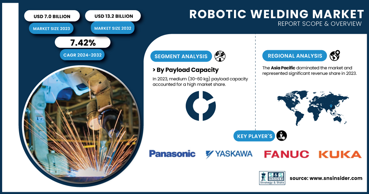 AUSTIN, TX, UNITED STATES, February 6, 2025 /EINPresswire.com/ -- According to SNS Insider, the robotic welding market was valued at USD 7.0 billion in 2023 and reach USD 13.2 Billion by 2032, growing at a CAGR of 7.42% from 2024-2032. The robotic welding market is on an upward trajectory, propelled by the pressing demand for increased precision, efficiency, and cost-effectiveness in manufacturing processes. The demand for robotic welding solutions is driven in part by initiatives to automate across industries, particularly automotive and aerospace.Get a Free Sample Report of Robotic Welding Market @ https://www.snsinsider.com/sample-request/4757