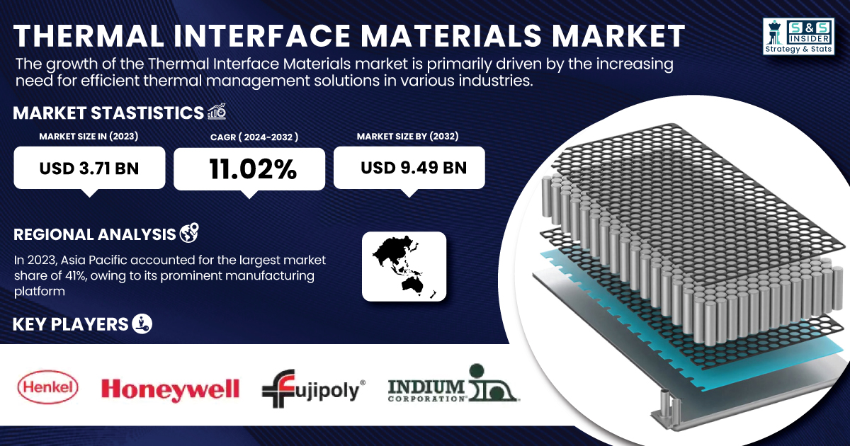 AUSTIN, TX, UNITED STATES, February 6, 2025 /EINPresswire.com/ -- The Thermal Interface Materials Market Size was valued at USD 3.71 Billion in 2023 and is expected to reach USD 9.49 Billion by 2032, growing at a CAGR of 11.02% over the forecast period of 2024-2032.Thermal Interface Materials (TIM) play a significant role in the thermal management of electronics and electric vehicle components. With an increasing demand, especially in the electric vehicle (EV) domain, the market has expanded because EV batteries require adequate thermal remedies. TIM demand continued to grow, especially in the telecom, consumer electronics, and industrial machinery sectors backed by the global electronics industry and innovations in 5G and AI technologies.