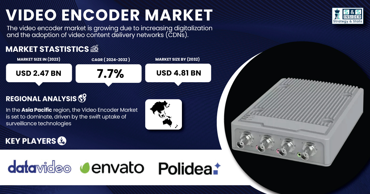 AUSTIN, TX, UNITED STATES, February 6, 2025 /EINPresswire.com/ -- Market Size & Industry InsightsAs Per the SNS Insider,“The Video Encoder Market was valued at USD 2.47 billion in 2023 and is expected to reach USD 4.81 billion by 2032, growing at a CAGR of 7.7% over the forecast period of 2024-2032.”
