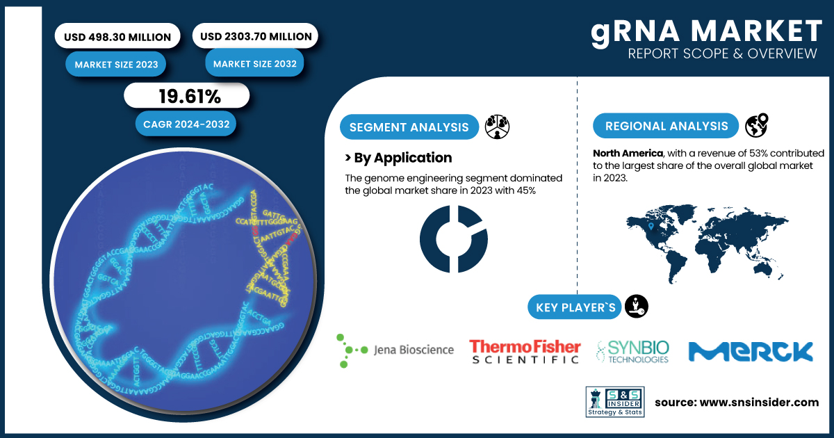 AUSTIN, TX, UNITED STATES, February 6, 2025 /EINPresswire.com/ -- According to Research by SNS Insider, The global gRNA market size was valued at USD 498.30 million in 2023 and is expected to reach USD 2,303.70 million by 2032, growing at a robust CAGR of 19.61% during the forecast period from 2024 to 2032. Increasing applications in genome engineering, demand for personalized therapies, and rising investments in genetic research are factors propelling this market growth.Get a Free Sample Report of gRNA Market @ https://www.snsinsider.com/sample-request/4484