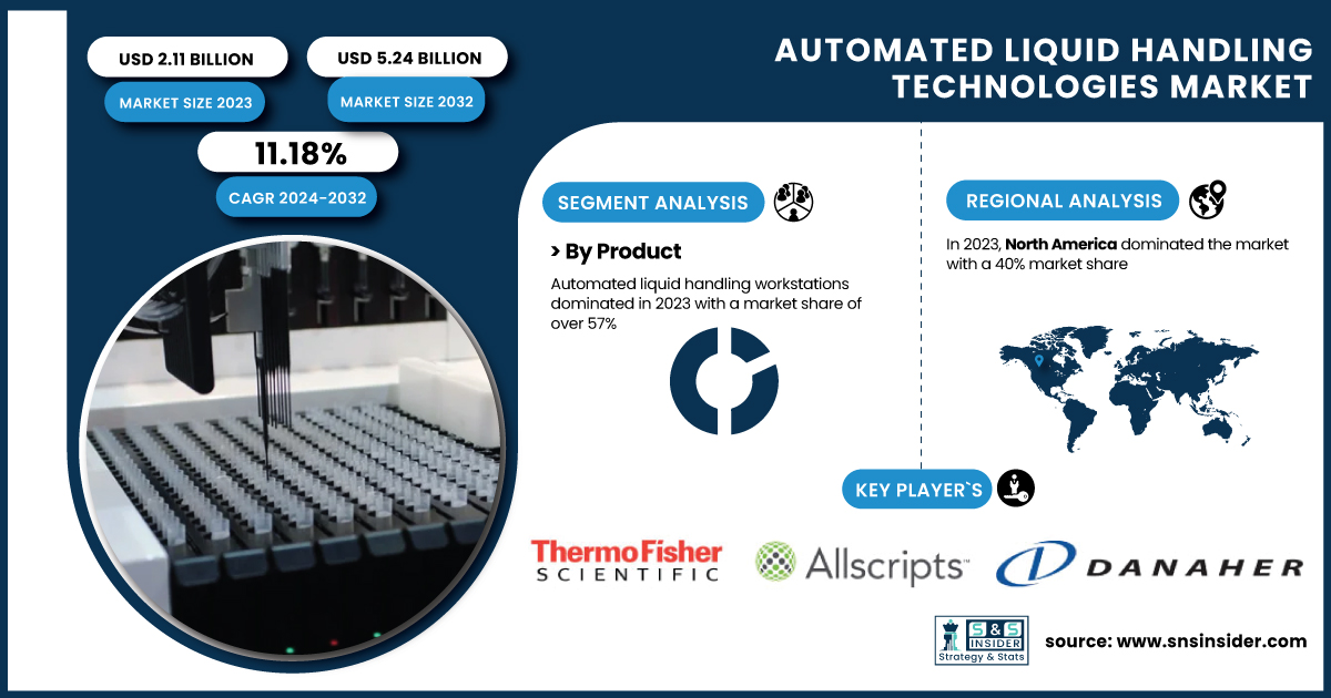 AUSTIN, TX, UNITED STATES, February 6, 2025 /EINPresswire.com/ -- According to Research by SNS Insider, The Automated Liquid Handling Technologies Market was valued at USD 2.11 billion in 2023 and is expected to reach USD 5.24 billion by 2032, growing at a robust CAGR of 11.18% during the forecast period from 2024 to 2032. The market growth is primarily driven by the increasing demand for automation in laboratories, the growing need for high-throughput research, and advancements in precision medicine.Get a Free Sample Report of Automated Liquid Handling Technologies Market @ https://www.snsinsider.com/sample-request/4485