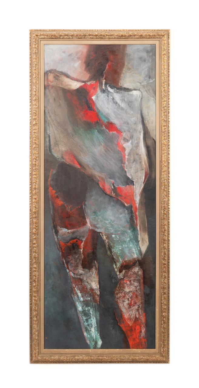Untitled oil on canvas abstract figural painting by Krishen Khanna (Indian / Pakistani, b. 1925), signed lower left, signed and dated to verso, 71 inches by 26 ¾ inches wide (canvas) (est. $20,000-$30,000).