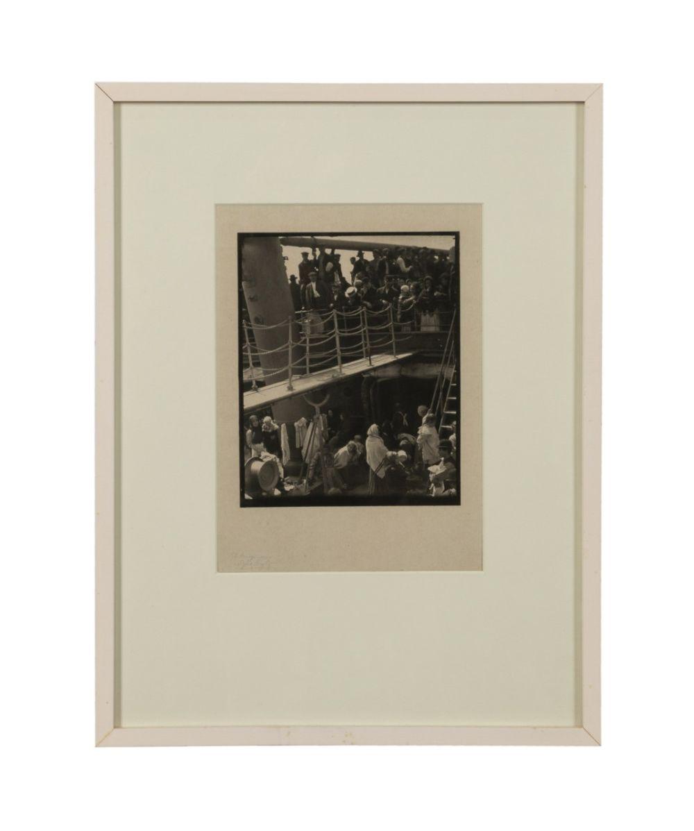 The small format photogravure on Japanese tissue paper mounted on board by Alfred Stieglitz, titled The Steerage, is pencil signed, titled and dated lower left, with a handwritten exhibition label ("An American Place, April 1937") by Stieglitz. This work was exhibited at Stieglitz's gallery and is expected to sell for $35,000-$50,000. Stieglitz was a noted photographer and modern art promoter.