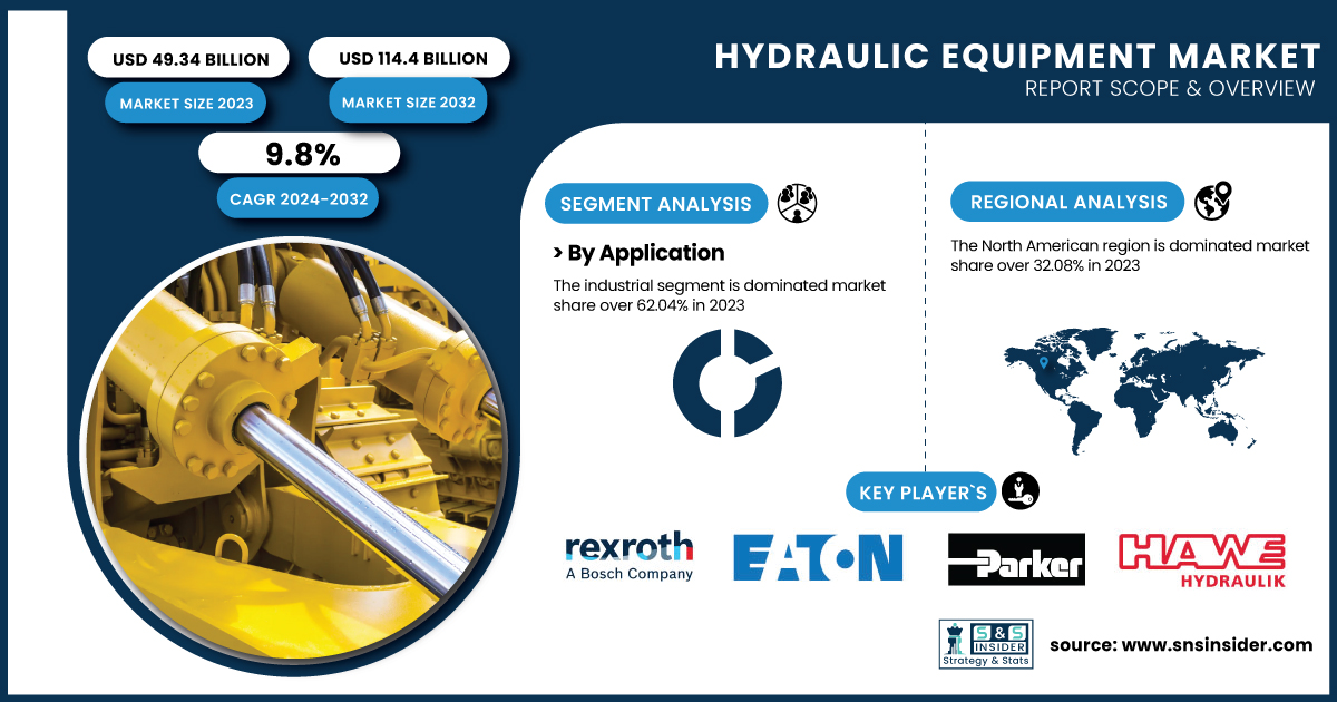 AUSTIN, TX, UNITED STATES, February 7, 2025 /EINPresswire.com/ -- The SNS Insider report indicates that the Hydraulic Equipment Market size was valued at USD 49.34 Billion in 2023 and is now anticipated to grow to USD 114.4 Billion by 2032, displaying a compound annual growth rate (CAGR) of 9.8% during the forecast period 2024-2032. This growth is largely attributed to advancements in hydraulic technology, along with the increasing need for efficient and high-powered machinery across diverse sectors."North America's Dominance in the Hydraulic Equipment Market is Driven by Growth in the FMCG, Food & Beverage, and pharmaceutical industries