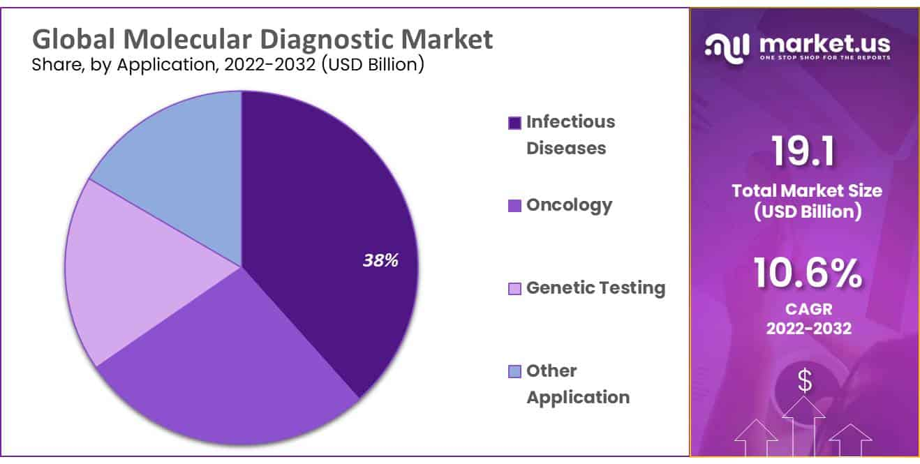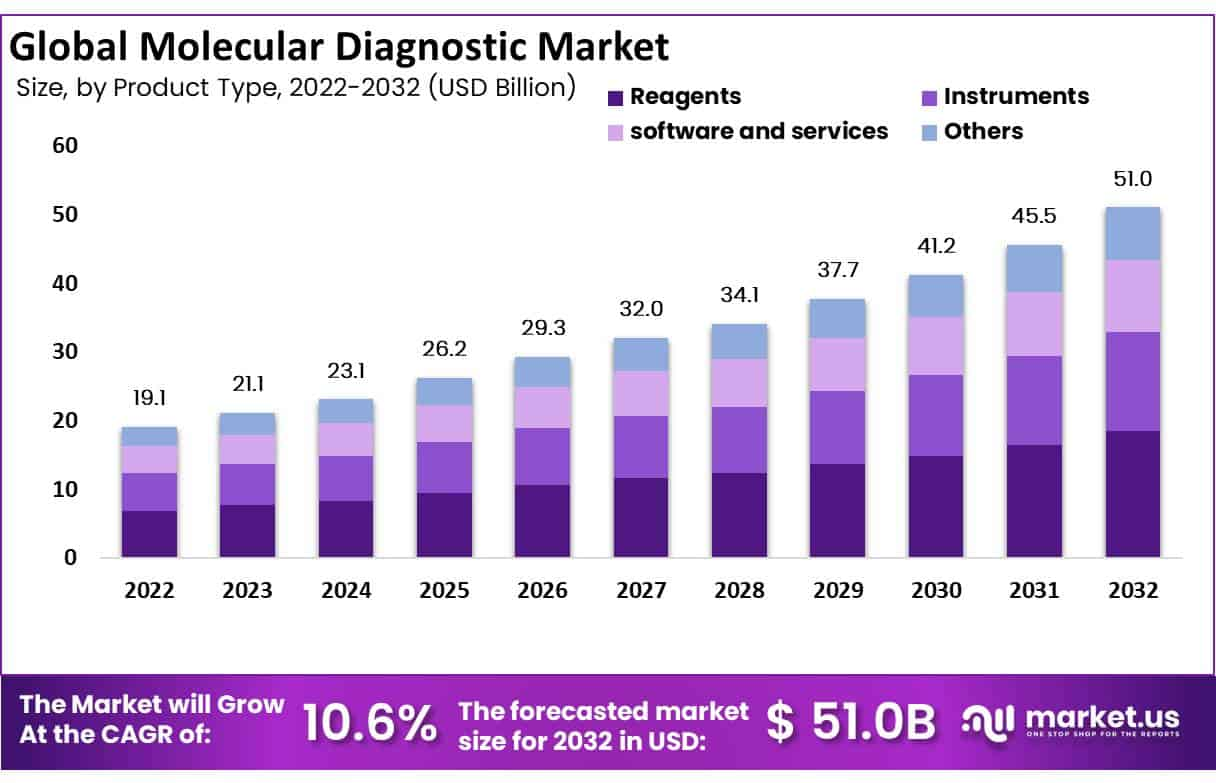 NEW YORK, NY, UNITED STATES, February 7, 2025 /EINPresswire.com/ -- The Molecular Diagnostic Market is projected to expand significantly, from USD 51 Billion in 2022 to an estimated USD 19.1 Billion by 2032, achieving a compound annual growth rate of 10.6% during the forecast period from 2023 to 2032. This growth is fueled by advancements in technologies such as next-generation sequencing (NGS) and polymerase chain reaction (PCR), which enhance the efficiency and accuracy of genetic material analysis. These innovations are crucial for rapid and precise disease diagnosis, streamlining the integration of molecular diagnostics in modern healthcare.Furthermore, the application of molecular diagnostics has broadened from a limited range of tests to encompassing a variety of diseases, including infectious diseases, oncology, and genetic disorders. This expansion is driven by a deeper understanding of the genetic foundations of diseases and the development of tests that can pinpoint specific genetic mutations. Additionally, the rising demand for personalized medicine, which utilizes molecular diagnostics to tailor treatments based on individual genetic profiles, underscores the sector’s significant impact on enhancing treatment efficacy and reducing adverse effects.