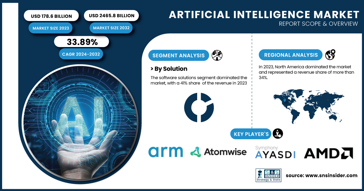 AUSTIN, TX, UNITED STATES, February 7, 2025 /EINPresswire.com/ -- The SNS Insider report indicates that the Artificial Intelligence Market size was valued at USD 178.6 billion in 2023 and is expected to grow to USD 2465.8 billion by 2032, expanding at a CAGR of 33.89% over the forecast period of 2024-2032. The increasing adoption of AI-driven automation across industries, coupled with advancements in deep learning and natural language processing, is fueling market growthGet Sample Copy of Report: https://www.snsinsider.com/sample-request/2801