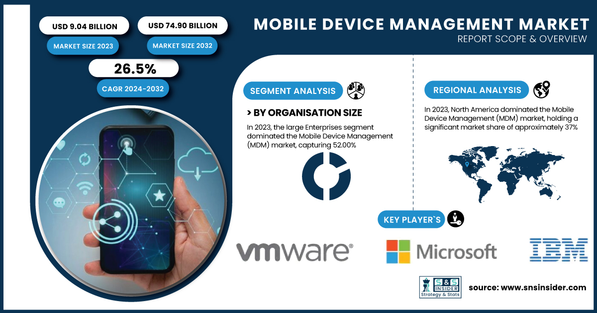 AUSTIN, TX, UNITED STATES, February 7, 2025 /EINPresswire.com/ -- The SNS Insider report indicates that the Mobile Device Management Market size was valued at USD 9.04 billion in 2023 and is expected to grow to USD 74.90 billion by 2032, with a CAGR of 26.5% over the forecast period of 2024-2032. The increasing reliance on mobile devices for business operations and the growing concerns over data security are key factors driving the Mobile Device Management Market.Get Sample Copy of Report: https://www.snsinsider.com/sample-request/2786
