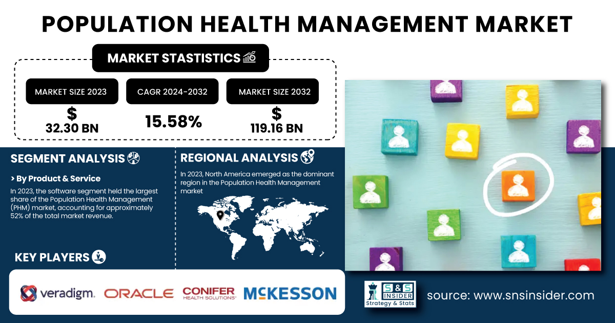 AUSTIN, TX, UNITED STATES, February 7, 2025 /EINPresswire.com/ -- According to Research by SNS Insider, The Population Health Management (PHM) Market was valued at USD 32.30 billion in 2023 and is projected to reach USD 119.16 billion by 2032, with a robust CAGR of 15.58% over the forecast period of 2024-2032. The market's rapid expansion is driven by the increasing adoption of value-based care models, advanced data integration, and analytics for effective patient population management.Key Players in the Population Health Management Market