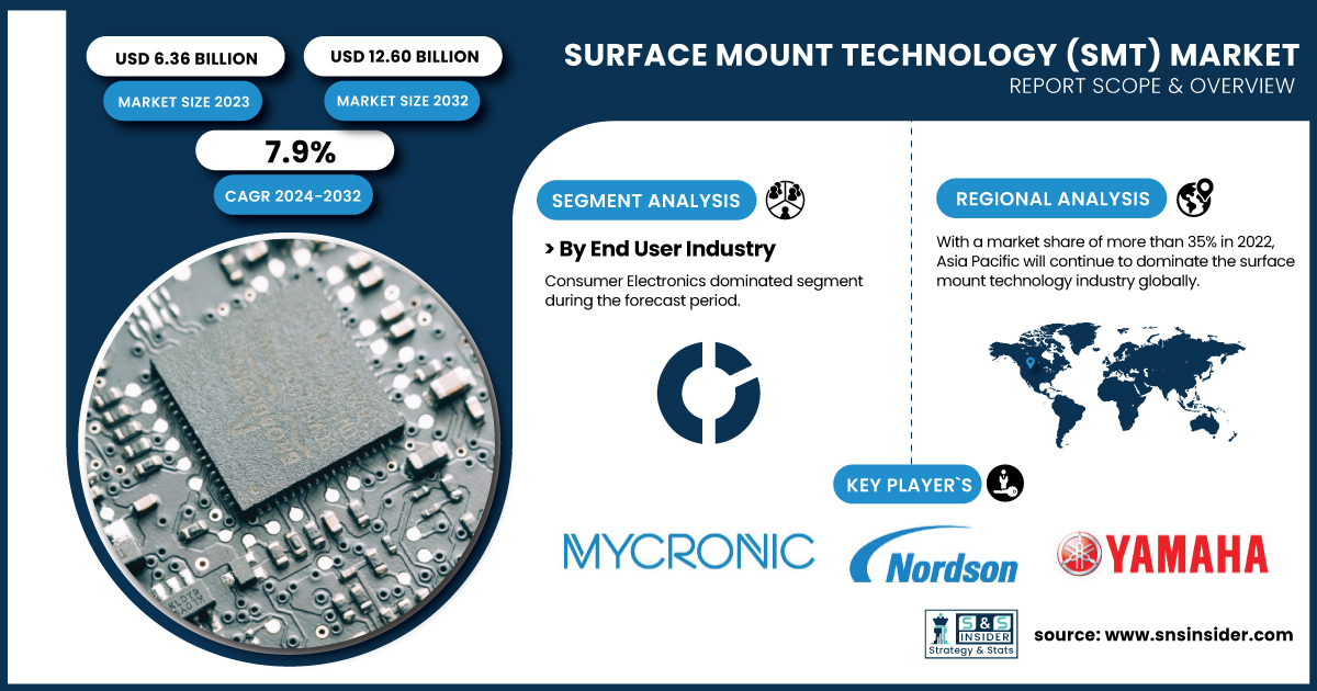 AUSTIN, TX, UNITED STATES, February 10, 2025 /EINPresswire.com/ -- Market Size & Industry InsightsAccording to the SNS Insider Report,“The Surface Mount Technology (SMT) Market was valued at USD 6.36 billion in 2023 and is expected to grow to USD 12.60 billion by 2032, at a CAGR of 7.9% over the forecast period of 2024-2032.”