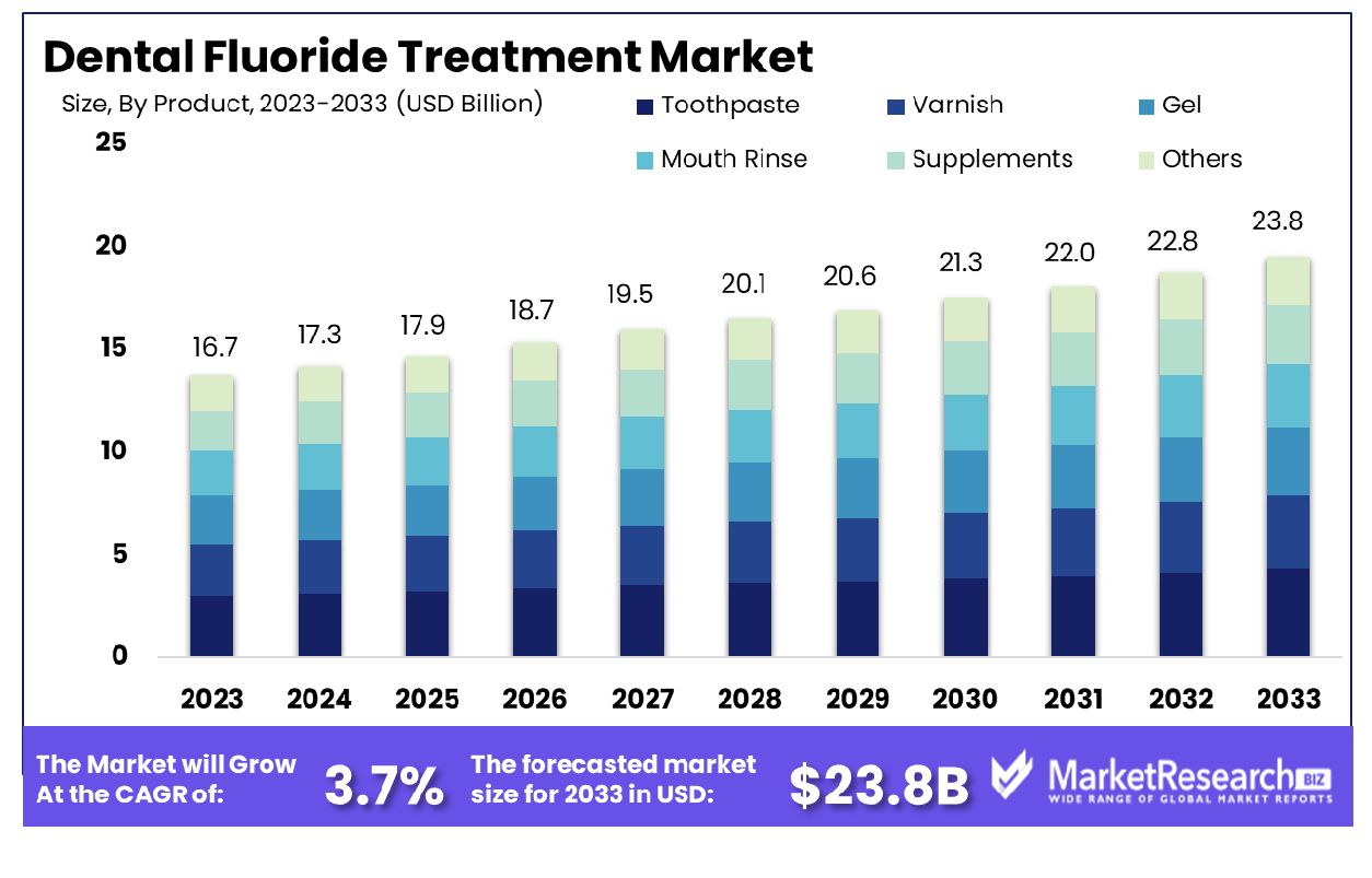 - Market Growth: The global dental fluoride treatment market was valued at USD 16.7 billion in 2023 and is projected to reach USD 23.8 billion by 2033, growing at a CAGR of 3.7% from 2024 to 2033.
