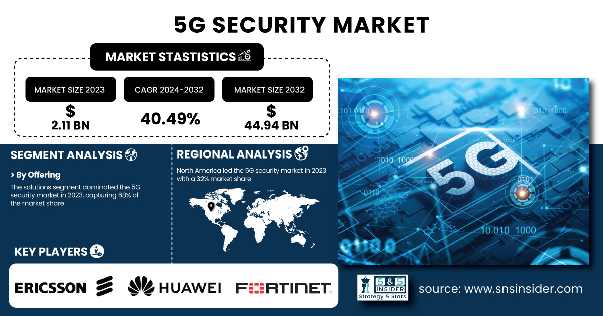 AUSTIN, TX, UNITED STATES, February 11, 2025 /EINPresswire.com/ -- The 5G Security Market was valued at USD 2.11 billion in 2023 and is projected to reach USD 44.94 billion by 2032, expanding at a 40.49% CAGR from 2024 to 2032. 5G deployments are growing across industries, as indicated by increasing adoption and usage metrics. Security and compliance metrics are region-dependent since regulatory landscapes can differ greatly. Secure networks propelled by increased efficiency and productivity metrics will see demand, while techno-economic and commercial development metrics highlight the growth of AI-powered cybersecurity and encryption solutions which will better secure now-vulnerability-packed 5G infrastructures.Get Sample Copy of Report: https://www.snsinsider.com/sample-request/3041
