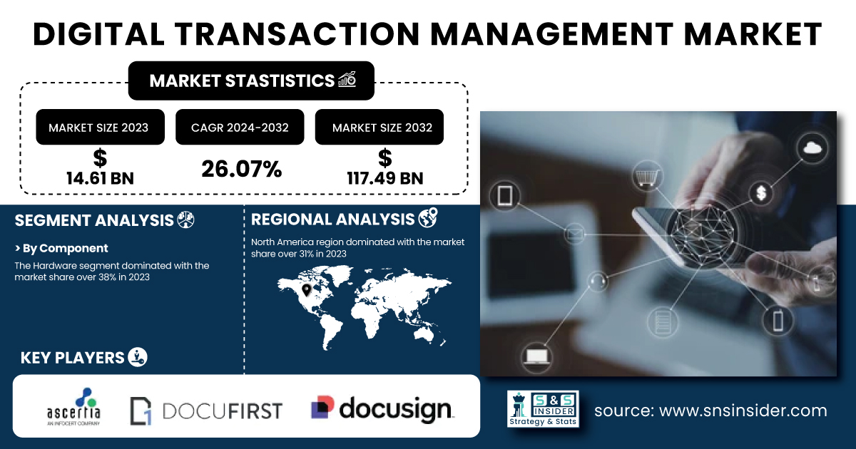 AUSTIN, TX, UNITED STATES, February 11, 2025 /EINPresswire.com/ -- The SNS Insider report indicates that the Digital Transaction Management Market was valued at USD 14.61 billion in 2023 and is expected to reach USD 117.49 billion by 2032, growing at a CAGR of 26.07% over the forecast period of 2024-2032. The increasing adoption of digital solutions for workflow automation, e-signatures, and authentication processes is propelling market growth.Get Sample Copy of Report: https://www.snsinsider.com/sample-request/3150
