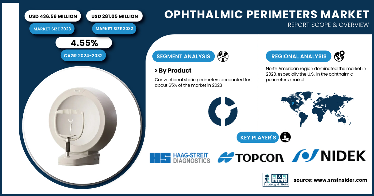 AUSTIN, TX, UNITED STATES, February 11, 2025 /EINPresswire.com/ -- According to Research by SNS Insider, The global Ophthalmic Perimeters Market was valued at USD 281.05 million in 2023 and is set to reach USD 436.56 million by 2032, growing at a CAGR of 4.55% during the forecast period 2024–2032.Rising cases of glaucoma, cataracts, and age-related macular degeneration (AMD) is a key factor propelling the global ophthalmic perimeters market currently. As estimated by WHO (World Health Organization), in 2023, nearly 76 million people worldwide were known to have glaucoma, and as populations continue to age, and the prevalence of diabetes and hypertension increases, so too of course will the number of people living with glaucoma. With increasing numbers of people facing visual difficulties, governments and healthcare organizations are investing in eye care programs. As an example, the National Eye Institute (NEI) in U.S. invested more than USD 850 million in ophthalmic research in U.S. in 2023 to drive the development of new diagnostic technologies.