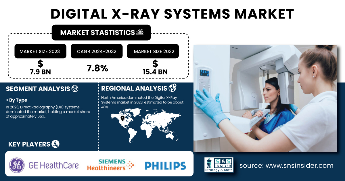 DIGITAL X-RAY SYSTEMS MARKET , TX, UNITED STATES, February 11, 2025 /EINPresswire.com/ -- According to a report by SNS Insider, the Digital X-Ray Systems Market, valued at USD 7.9 billion in 2023, is projected to reach USD 15.4 billion by 2032, growing at a CAGR of 7.8% during the forecast period 2024-2032. The increasing demand for advanced imaging solutions, the rise in chronic disease prevalence, and technological advancements in digital radiography are key factors fueling this market's expansion.Prominent companies shaping the Digital X-Ray Systems Market include: