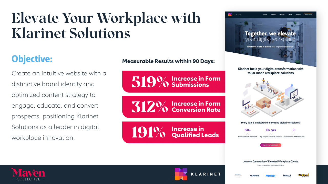 Maven’s award-winning overhaul significantly enhanced user engagement for Klarinet Solutions, bringing their tagline, "Elevate Your Workplace," to life. This optimization of the digital experience also highlighted Klarinet’s proprietary Elevated Success Framework, a key differentiator in their role as a Microsoft Partner.