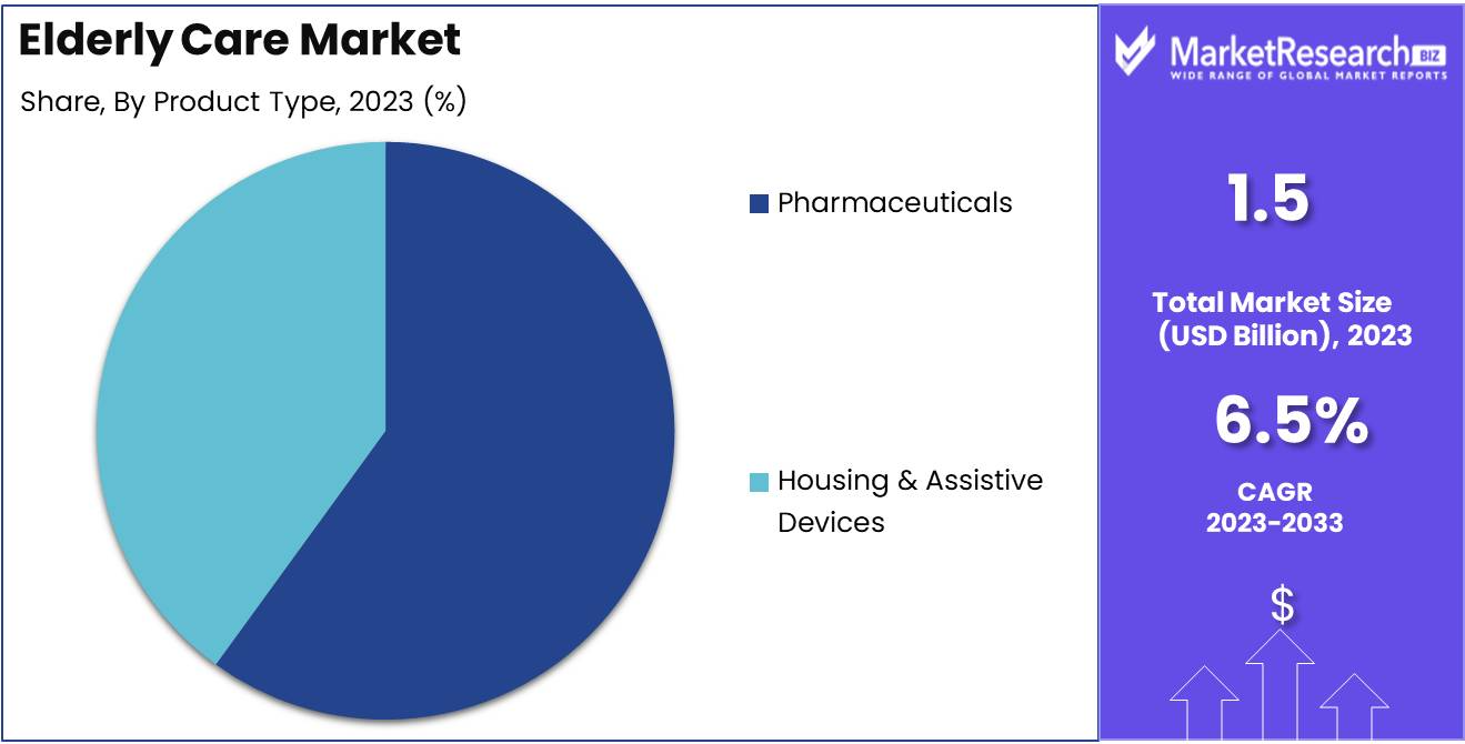 •By Product Type Analysis: Pharmaceuticals dominated the Elderly Care Market in 2023, holding over 60% of the product type segment. This is attributed to the rising prevalence of chronic diseases, requiring consistent medication management. Prescription and over-the-counter drugs are vital for treating heart disease, diabetes, and neurological conditions. Housing & Assistive Devices, including mobility aids and home modifications, are also crucial, promoting independence and safety. As aging populations grow, demand for assistive solutions continues to rise, complementing pharmaceutical interventions.