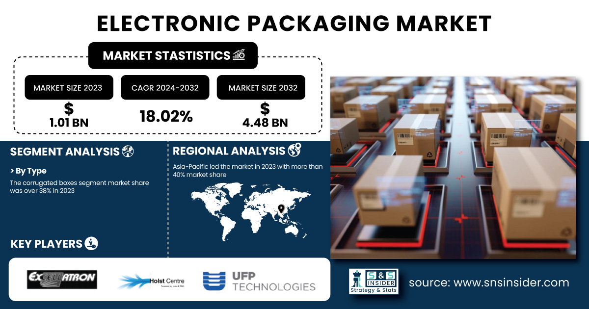 AUSTIN, TX, UNITED STATES, February 12, 2025 /EINPresswire.com/ -- Market Size & Industry InsightsAs Per the SNS Insider,“The Electronic Packaging Market size was valued at USD 1.01 billion in 2023 and is expected to reach USD 4.48 billion by 2032 and grow at a CAGR of 18.02% over the forecast period 2024-2032.”