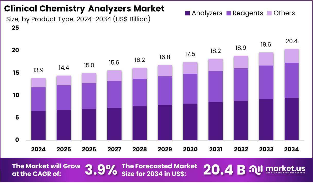 NEW YORK, NY, UNITED STATES, February 12, 2025 /EINPresswire.com/ -- The Global Clinical Chemistry Analyzers Market is projected to reach USD 20.4 billion by 2034, growing from USD 13.9 billion in 2024 at a CAGR of 3.9% from 2025 to 2034. The market's growth is primarily driven by advancements in laboratory automation, rising demand for diagnostic tests, integration of information technology, and expanding point-of-care testing (PoCT). Automated systems have improved the efficiency and accuracy of diagnostic procedures, minimizing human errors and increasing laboratory throughput. This has led to the widespread adoption of advanced clinical chemistry analyzers in healthcare facilities.The rising prevalence of chronic diseases and an aging global population are fueling the demand for laboratory testing. As the need for frequent and detailed diagnostics increases, healthcare providers are investing in high-performance analyzers to enhance patient care. Additionally, IT integration in laboratory workflows has improved data management and result retrieval, ensuring better communication among healthcare professionals. These developments streamline diagnostic processes, allowing for quicker and more accurate clinical decisions.