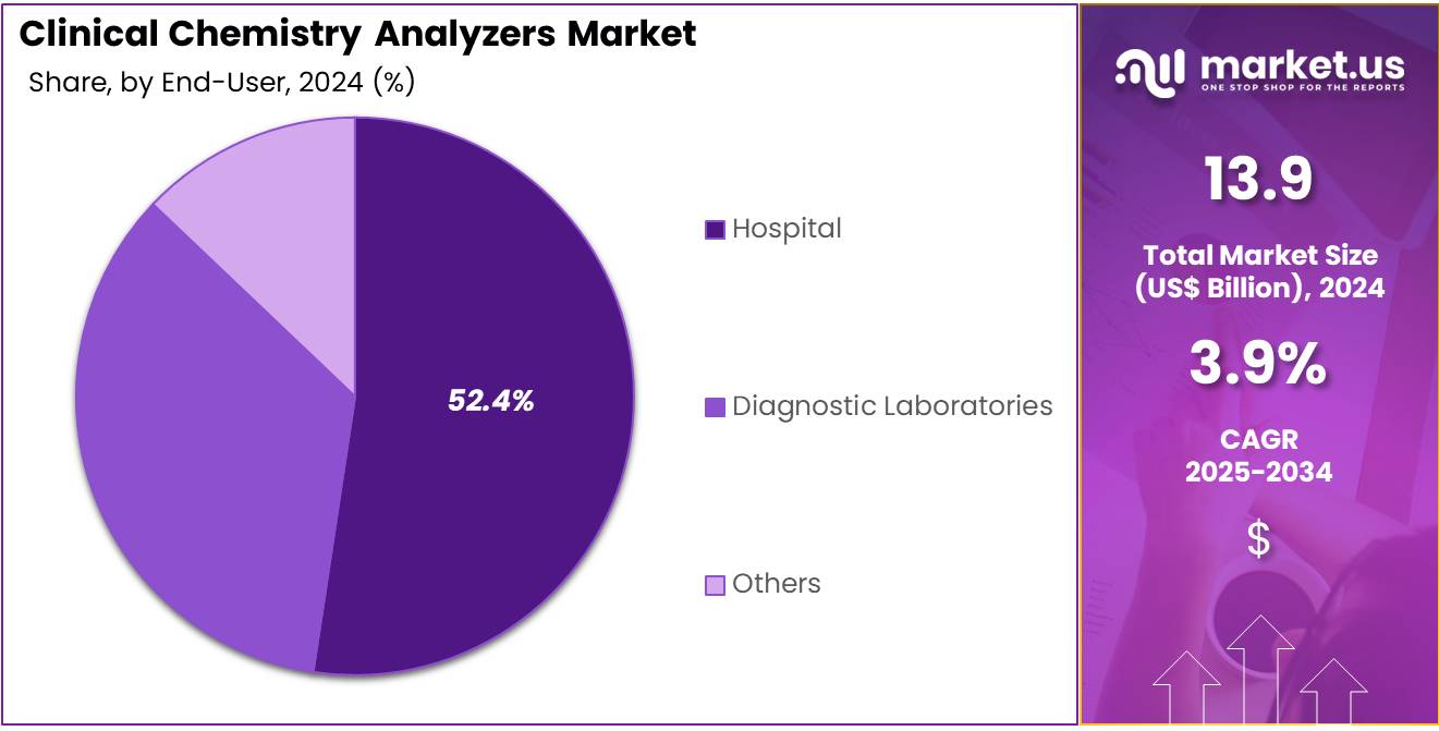 Hospitals accounted for a 52.4% revenue share, driven by the rising demand for diagnostic tests. The increasing number of hospital admissions has fueled the need for advanced chemistry analyzers. These tools are crucial for disease diagnosis and management. Hospitals prioritize early detection to improve patient outcomes and reduce diagnostic errors. The integration of automated and AI-driven analyzers enhances efficiency and accuracy. As preventive healthcare gains focus, hospitals are expected to continue investing in advanced diagnostic solutions to meet growing healthcare demands.