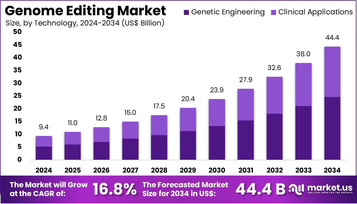 Genome Editing Market Size is expected to reach US$ 44.4 Bn by 2034, from US$ 9.4 Bn in 2024, growing at a CAGR of 16.8% (2025-2034).