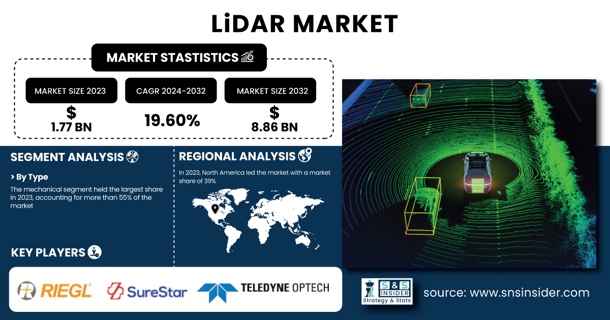 AUSTIN, TX, UNITED STATES, February 13, 2025 /EINPresswire.com/ -- Market Size & Industry InsightsAccording to the SNS Insider Report,“The LiDAR Market Size is valued at USD 1.77 Billion in 2023 and expected to reach USD 8.86 Billion by 2032, growing at a CAGR of 19.60% during 2024-2032.”