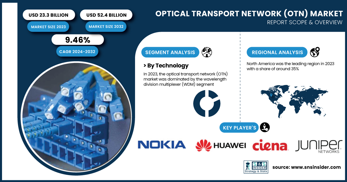 AUSTIN, TX, UNITED STATES, February 13, 2025 /EINPresswire.com/ -- The SNS Insider report indicates that the Optical Transport Network Market size was valued at USD 23.3 billion in 2023 and is expected to grow to USD 52.4 billion by 2032, expanding at a CAGR of 9.46% over the forecast period of 2024-2032. The escalating need for high-speed data transmission across various industries is propelling the growth of the Optical Transport Network market.Get Sample Copy of Report: https://www.snsinsider.com/sample-request/4729