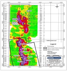 - Mink’s exploration and drilling at Warren has demonstrated the potential for deposition of nickel, copper, cobalt deposits and identified a new prospective copper exploration target within volcanics along the gabbro intrusive contact. Many of the property’s geophysical targets and multiple surface occurrences of Ni, Cu, Co warrant follow up or are totally untested. This includes priority targets such as the North Zone massive sulphide zone which returned confirmation grab samples of 0.967% Ni, and 0.0723% Co. (See press release September 4, 2024.)