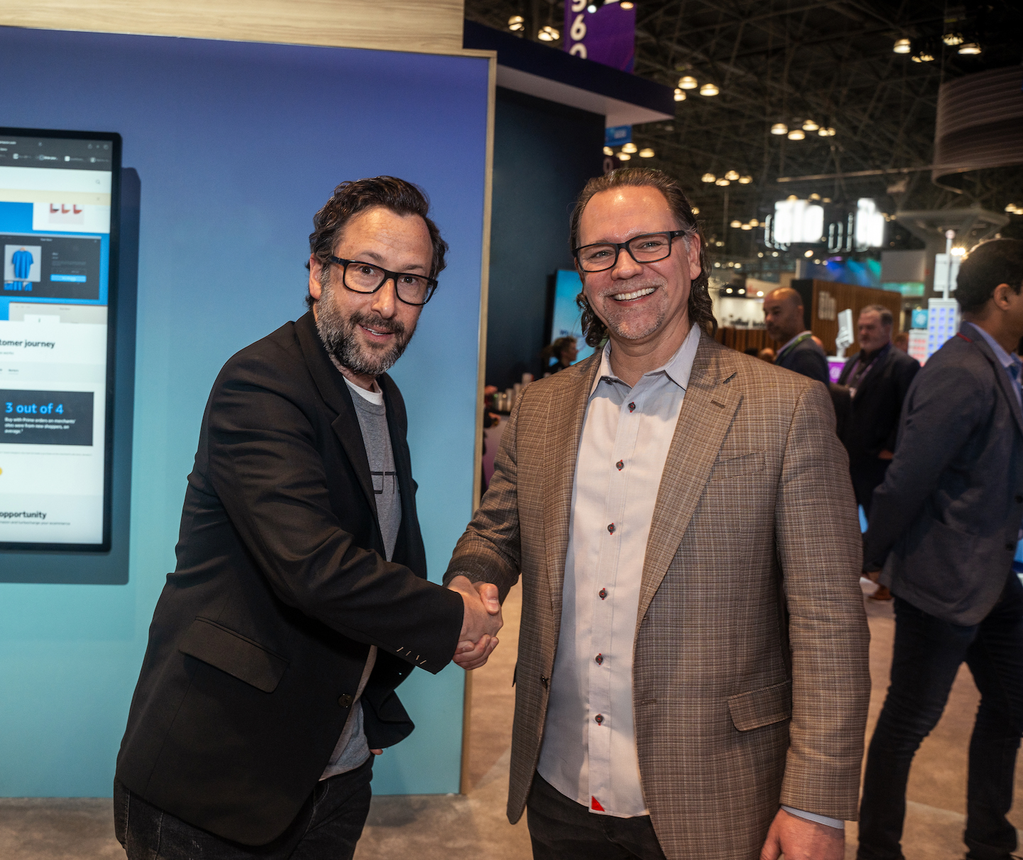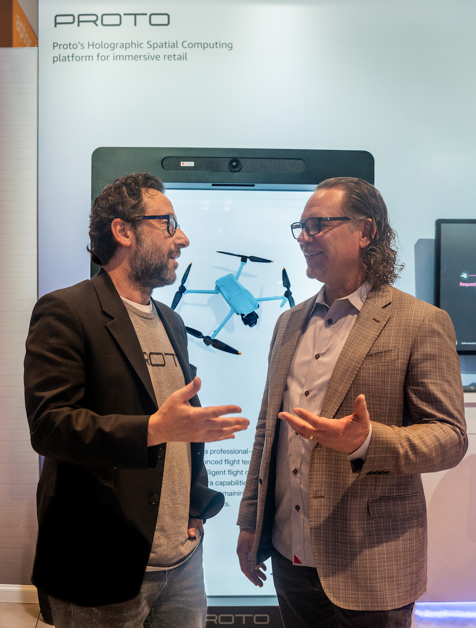 Founder and Chairman David Nussbaum (left) and CEO Todd Bouman demonstrate Proto's AI Hologram tools for retail at NRF 2025. (Photo: Eli Edwards)