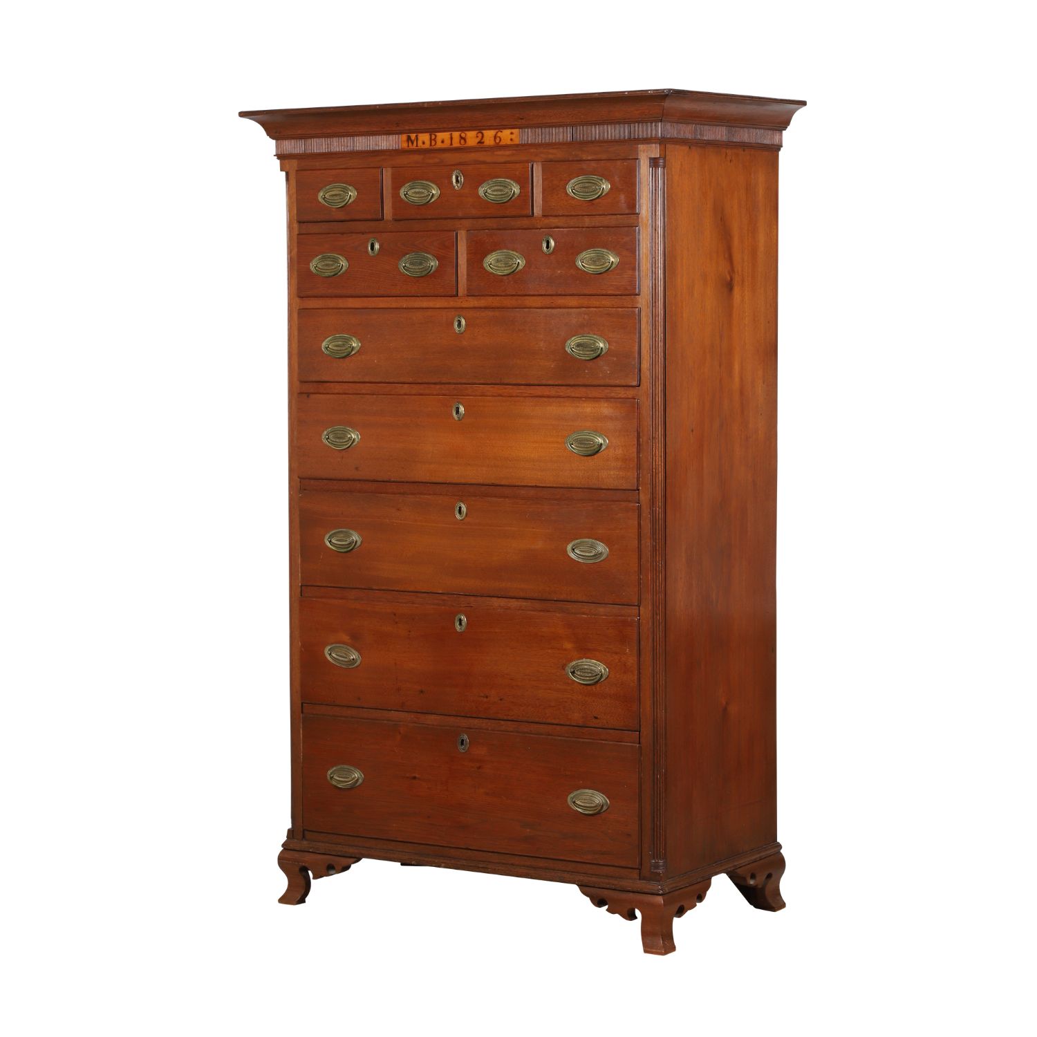 Walnut chest of drawers from Waterloo County, commissioned as a wedding gift by Samuel Bricker (1776-1868) to his eldest daughter Mary, 70 ½ inches tall (CA$35,400).