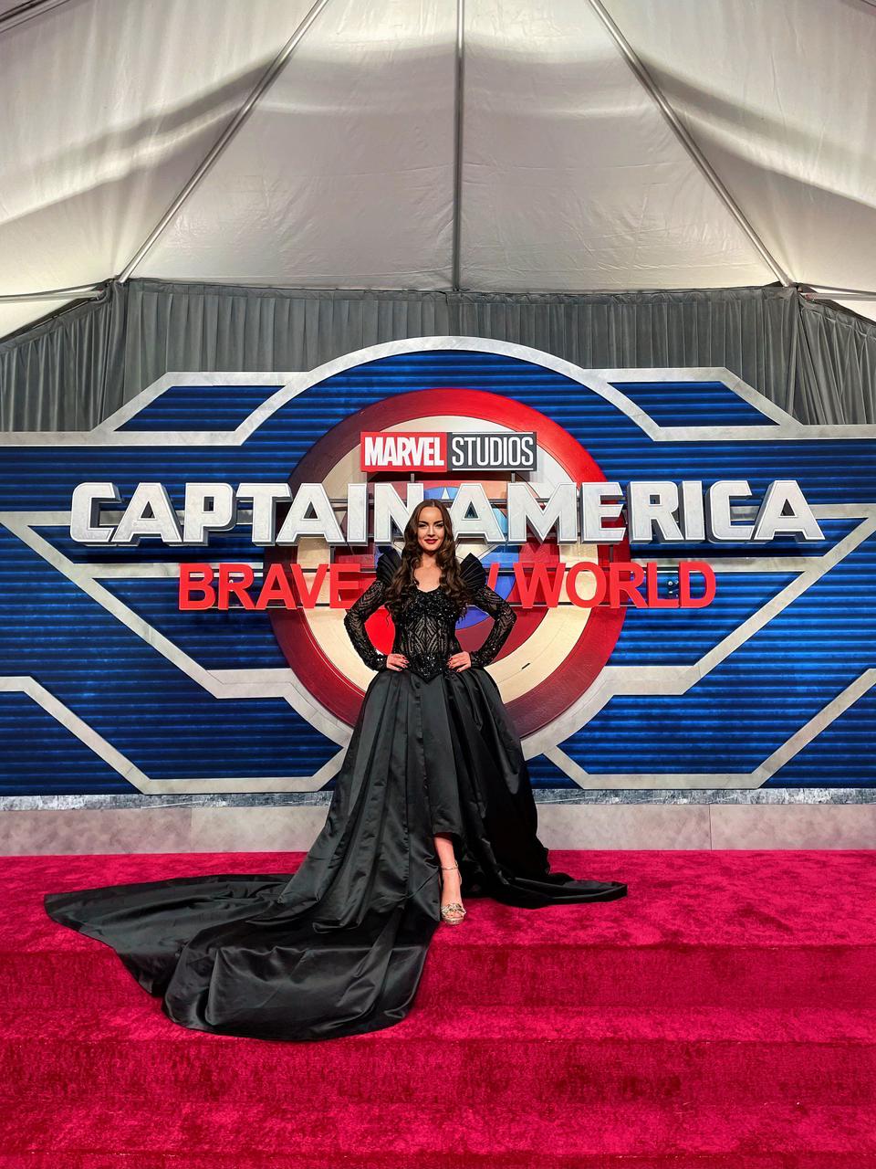 “ I am fascinated by the concept that Mark Gruenwald has pioneered representing the character crossover in a merging of dualities in which villains turned superheroes, awakened to their humanity through existential catharsis, vowing to change their ways. The movie Captain America: Brave New World is precisely why we were here; to bring attention to the unifying forces that inspire transformation, as a global population for the greater good. Nighthawk's female version—known as Empress Seraphina from Earth 31916—was presented on the red carpet to usher in this paradigm shift, when darkness transforms into Light. My epic ballgown commissioned by Re'Malhi Haute Couture, symbolized this change by merging Haute Couture and Comics in epic Fashion.”