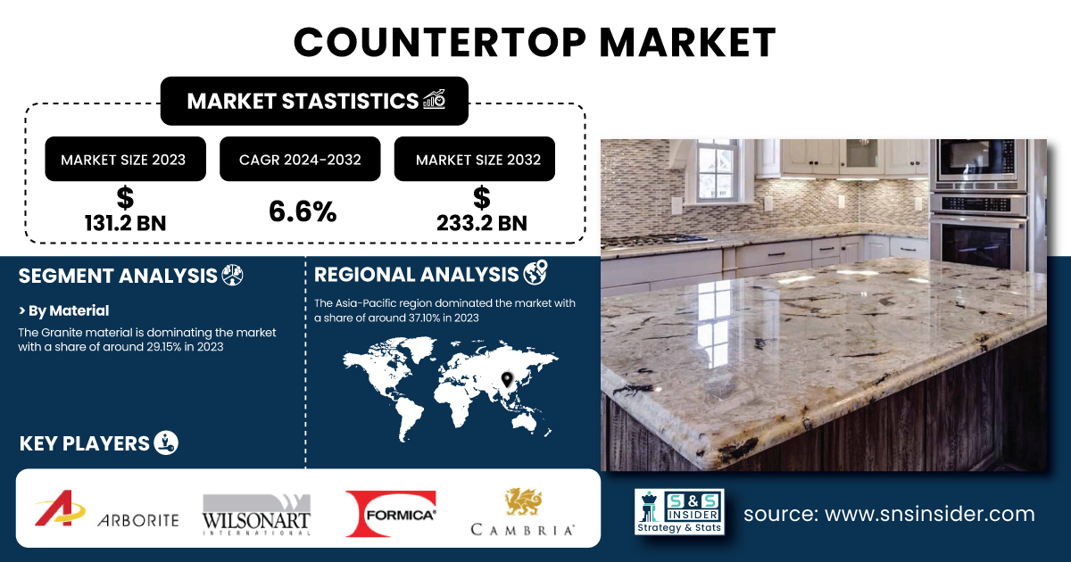 AUSTIN, TX, UNITED STATES, February 14, 2025 /EINPresswire.com/ -- The SNS Insider report indicates that the Countertop Market size was valued at USD 131.2 Billion in 2023 and is now anticipated to grow to USD 233.2 Billion by 2032, displaying a compound annual growth rate of 6.6% during the forecast period 2024-2032.The Countertop Market is being driven by the growing demand for home renovations, increasing disposable incomes, and rapid growth in the construction industry in emerging economies.Get a Sample Report of Countertop Market @ https://www.snsinsider.com/sample-request/4300