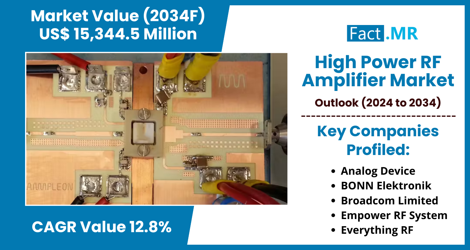 ROCKVILLE, MD, UNITED STATES, February 14, 2025 /EINPresswire.com/ -- The global high-power RF Amplifier market is set to reach a valuation of US$ 4,613.8 Mn in 2024 and further expand at a CAGR of 12.8% to end up at US$ 15,344.5 Mn by the year 2034.High-power RF amplifiers, which improve signal strength for applications including telecommunication, satellite communication, and wireless networking, are a major factor in the rising demand for high-speed data transmission. These amplifiers are essential for enabling quick data transfer over extended distances with no signal deterioration. For example, in order to handle high frequencies and data rates in the 5G era and ensure improved connectivity and efficiency, more powerful RF amplifiers are needed. Similar to this, high-power RF amplifiers are necessary for satellite communications in order to transfer massive amounts of data between satellites and ground stations. These amplifiers are becoming more and more necessary in data-centric applications as the number of linked devices and high-speed internet services increases.