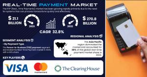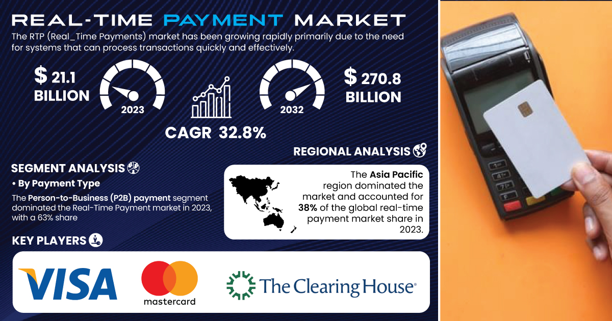 AUSTIN, TX, UNITED STATES, February 14, 2025 /EINPresswire.com/ -- “The Real-Time Payment market is growing rapidly, driven by digitalization, security needs, and government initiatives across industries.”The Real-Time Payment Market was valued at USD 21.1 billion in 2023 and is projected to reach USD 270.8 billion by 2032, growing at a CAGR of 32.8% from 2024 to 2032. This rapid growth is driven by the adoption of emerging technologies, network infrastructure expansion, and increasing cloud services usage across regions. Furthermore, the rising frequency of cybersecurity incidents and the demand for secure, instant transactions contribute to the market's expansion, especially in sectors like finance and e-commerce.