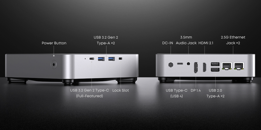 The AuBox 8745HS's USB 4, USB-C, HDMI, and DisplayPort allow users to connect up to four 4K displays simultaneously. USB 4, USB-C, and HDMI provide ultra-smooth visuals at up to 4K@144Hz, perfect for gaming, productivity, and immersive multimedia experiences.