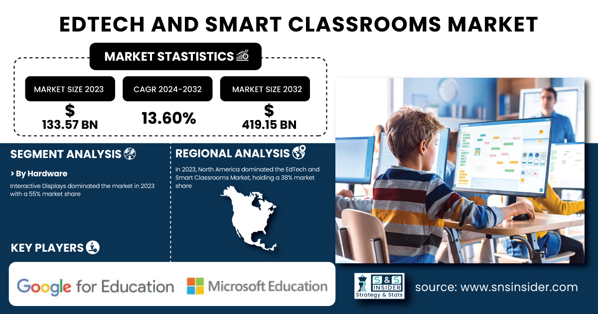 AUSTIN, TX, UNITED STATES, February 17, 2025 /EINPresswire.com/ -- The EdTech and Smart Classrooms Market size was valued at USD 133.57 billion in 2023 and is expected to reach USD 419.15 billion by 2032, growing at a CAGR of 13.60% over the forecast period 2024-2032. This report includes insights on customer adoption rates, cost metrics, technological advancements, and security and compliance metrics. The market is driven by increasing digitalization in education, rising demand for personalized learning, and integration of AI and IoT. Cost efficiency, regulatory standards, and regional adoption trends also shape market growth.Get Sample Copy of Report: https://www.snsinsider.com/sample-request/2546