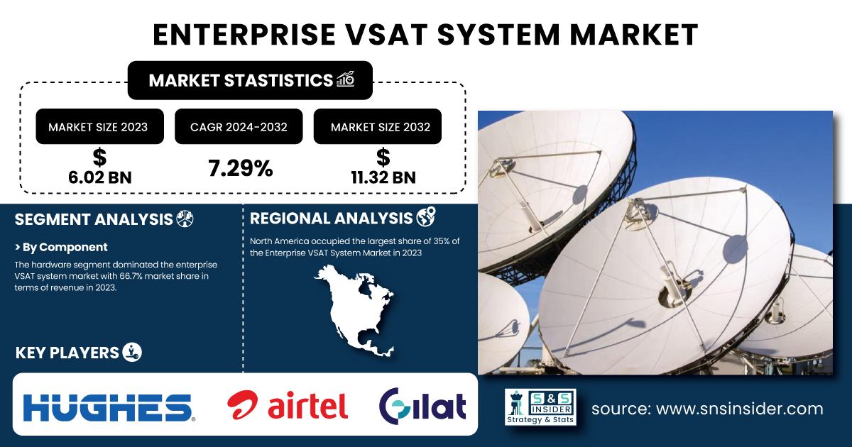 AUSTIN, TX, UNITED STATES, February 17, 2025 /EINPresswire.com/ -- The Enterprise VSAT System Market was valued at USD 6.02 billion in 2023 and is expected to reach USD 11.32 billion by 2032, growing at a CAGR of 7.29% from 2024 to 2032. Growth is driven by increasing adoption by enterprises, the growing demand for low-latency and high-bandwidth communication, and ongoing technological innovations. Broader geographic reach and continuous innovation on the VSAT systems front are improving efficiency and reliability, making it a key technology for all industries operating in remote and underserved areas.Get Sample Copy of Report: https://www.snsinsider.com/sample-request/2614