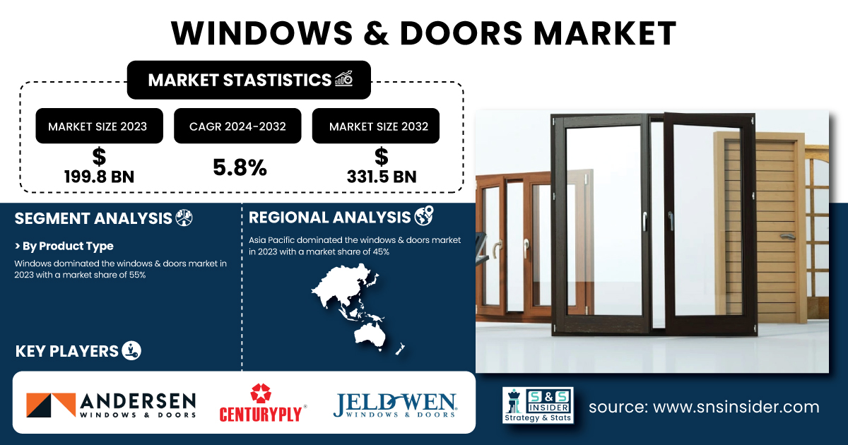 AUSTIN, TX, UNITED STATES, February 17, 2025 /EINPresswire.com/ -- The windows & doors market was valued at USD 199.8 billion in 2023 and is projected to reach USD 331.5 billion by 2032, growing at a CAGR of 5.8% from 2024 to 2032. The rise in construction activities alongside strict regulations by the government, as well as, initiatives taken concerning sustainable and energy-efficient buildings are the factors driving the market growth. Windows and doors are an important element of green building, as they are one of the major contributors to thermal insulation and energy conservation. Moreover, the availability and advancements in technological materials like uPVC, fiberglass, and composite wood are also boosting the market by providing better durability, aesthetics, and security.Get a Sample Report of Windows & Doors Market @ https://www.snsinsider.com/sample-request/2933