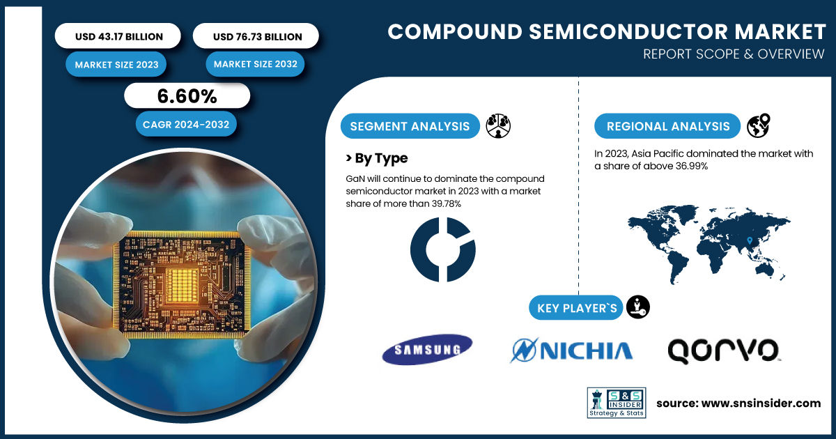 AUSTIN, TX, UNITED STATES, February 17, 2025 /EINPresswire.com/ -- Market Size & Industry InsightsAccording to the SNS Insider Report,“The Compound Semiconductor market was valued at USD 43.17 billion in 2023 and is expected to grow to USD 76.73 billion by 2032, at a CAGR of 6.60% over the forecast period of 2024-2032.”