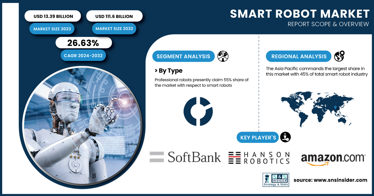 AUSTIN, TX, UNITED STATES, February 17, 2025 /EINPresswire.com/ -- Market Size & Industry InsightsAccording to the SNS Insider Report,“The Smart Robot market was valued at USD 13.39 billion in 2023 and is expected to grow to USD 111.6 billion by 2032, at a CAGR of 26.63% over the forecast period of 2024-2032.”